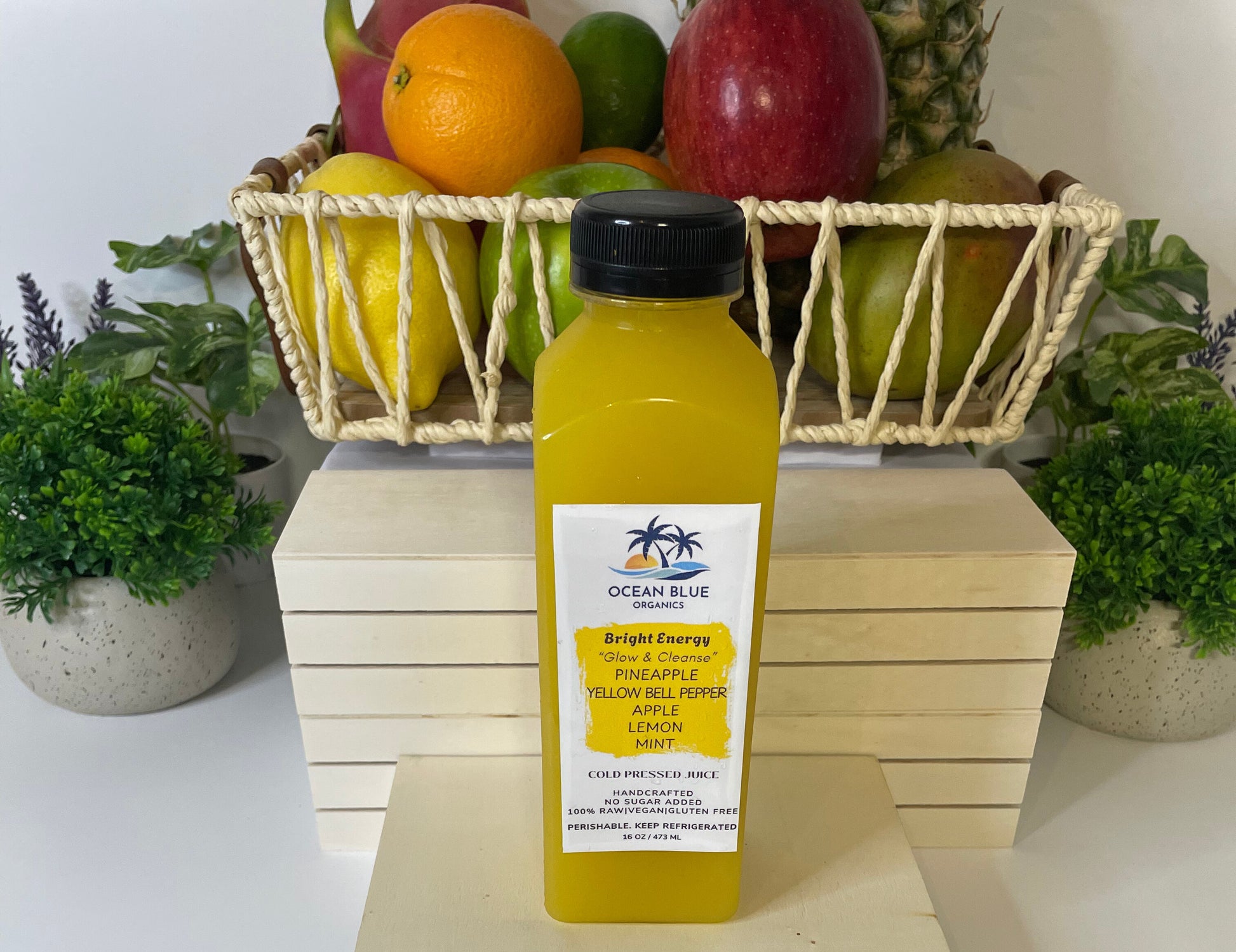 Fuel your day with Bright Energy. A vibrant blend of pineapple, yellow bell pepper, apple, lemon, and mint, this juice offers a crisp, revitalizing lift with a burst of tropical tang. This bundle includes three (3) 16 oz bottles of our signature cold pressed blends. Whether you’re sipping daily or sharing with someone, this 3-pack keeps the wellness flowing.